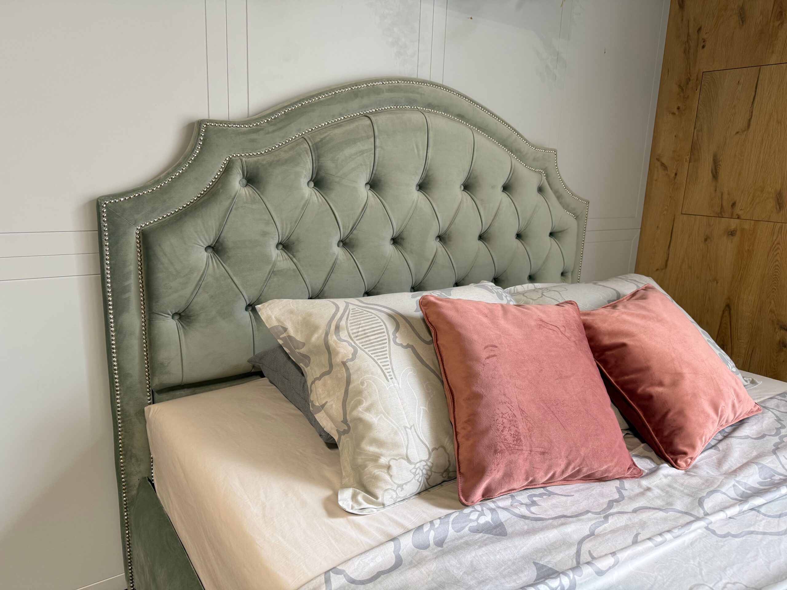 Легло: Тапицерия – дамаска – плюш. Табла – високоеластична полиуретанова пяна начин на работа – ръчен – свободен капитонаж. Заработен вътрешен мост за допълнителна устойчивост и здравина на леглото. Всички използвани сглобки са метални – скрит монтаж – за изряден външен вид на изделието.