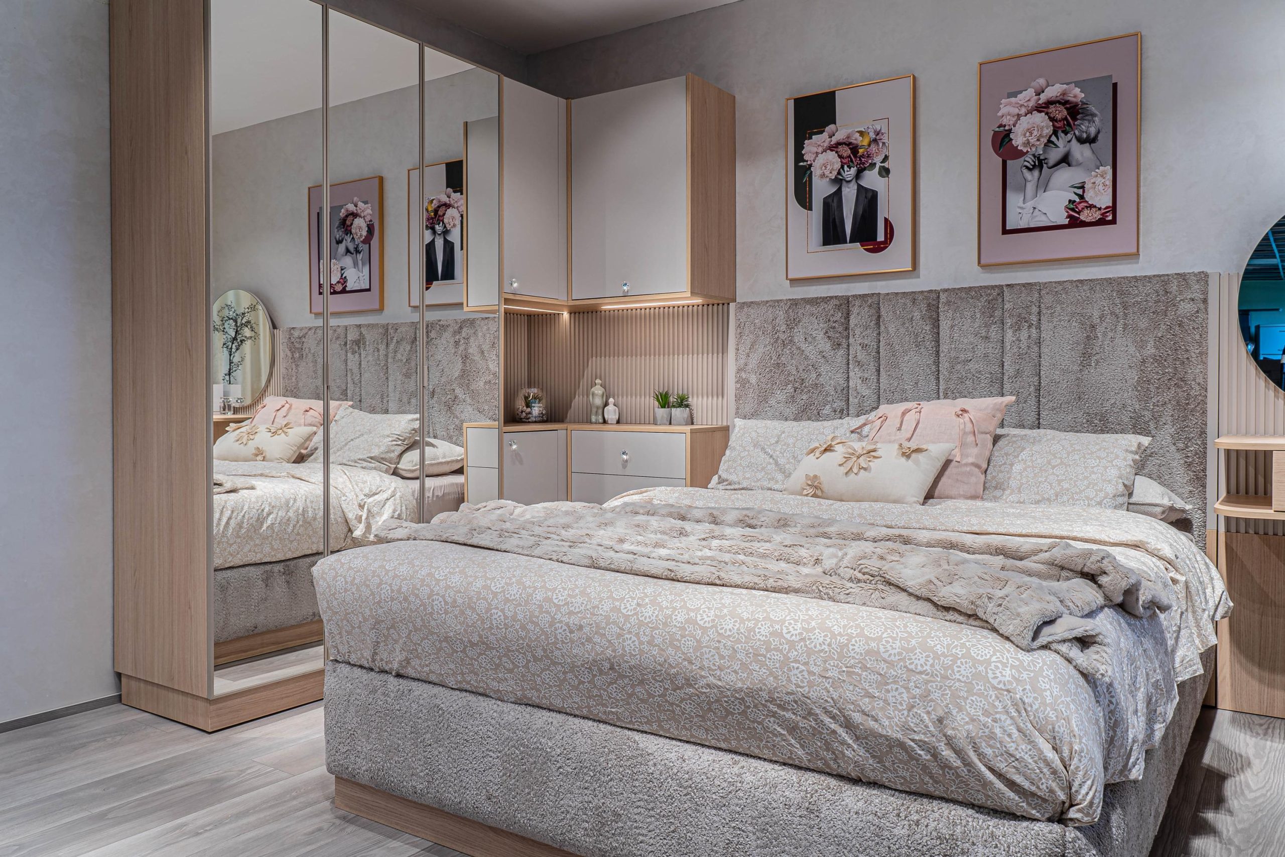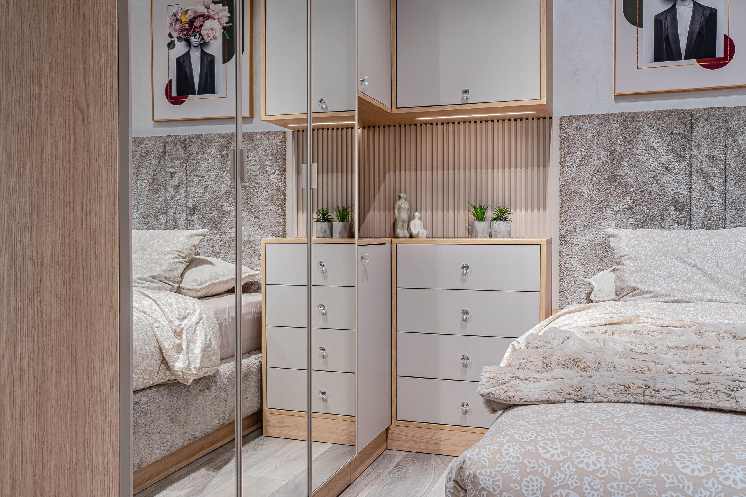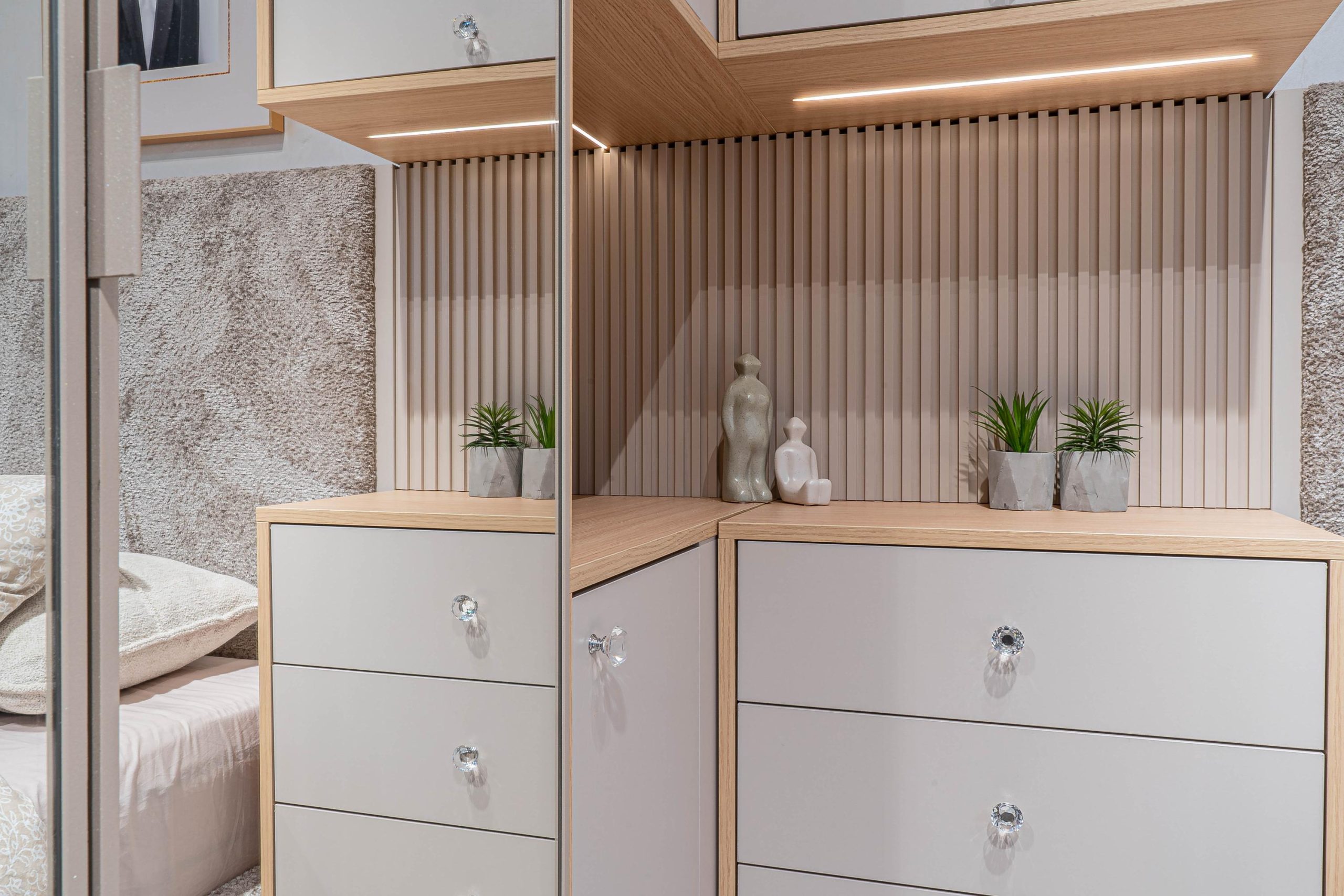 Ъглов шкаф – Вградено деликатно LED осветление – режим на работа – дистанционно – топла светлина – вкл. в цената. MDF гравиран на канали гръб – боя мат – цвят – кашмир. Дръжки – полиран кристал – безцветен. Водач на чекмеджетата – скрити Quadro Hettich – плавно затваряне, панти на вратите – плавно затваряне опция – реглаж – 1 бр. в к-т;