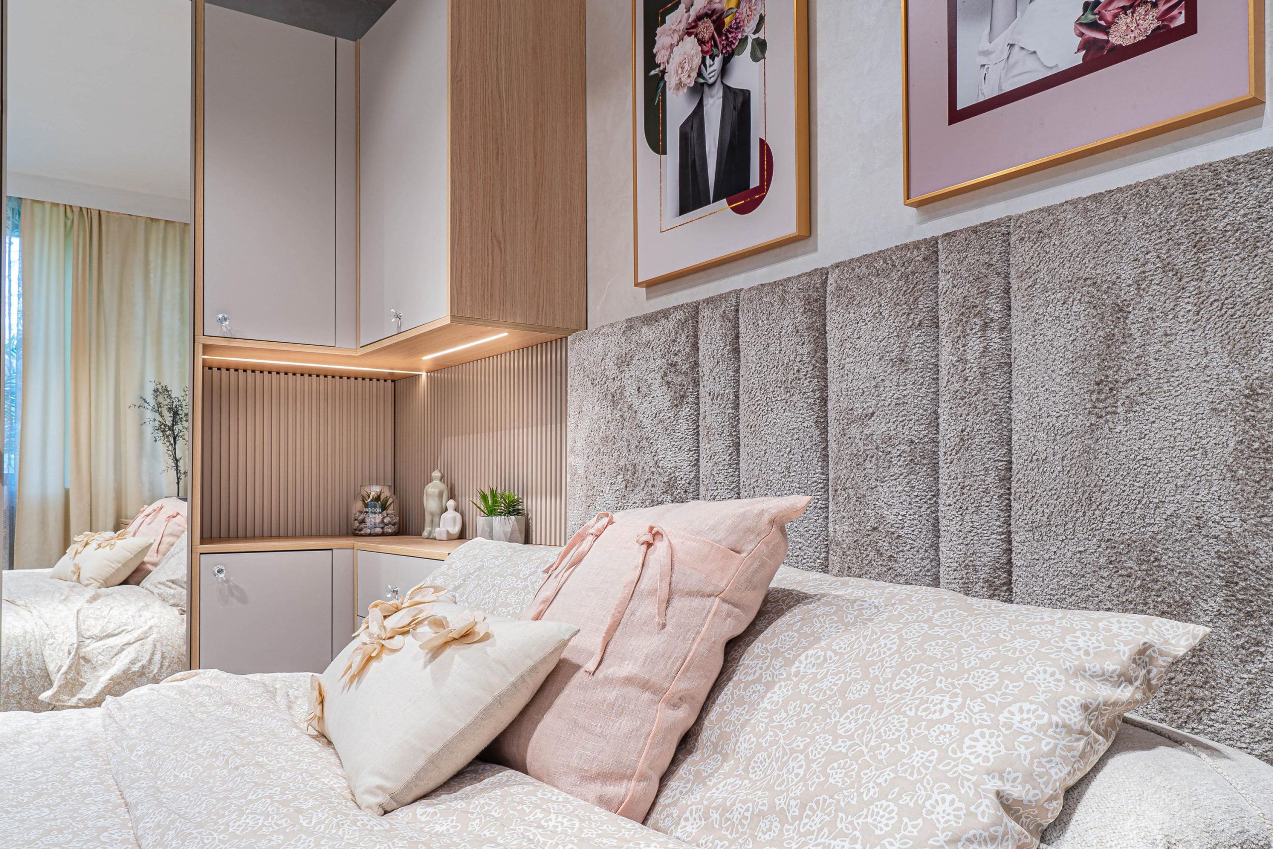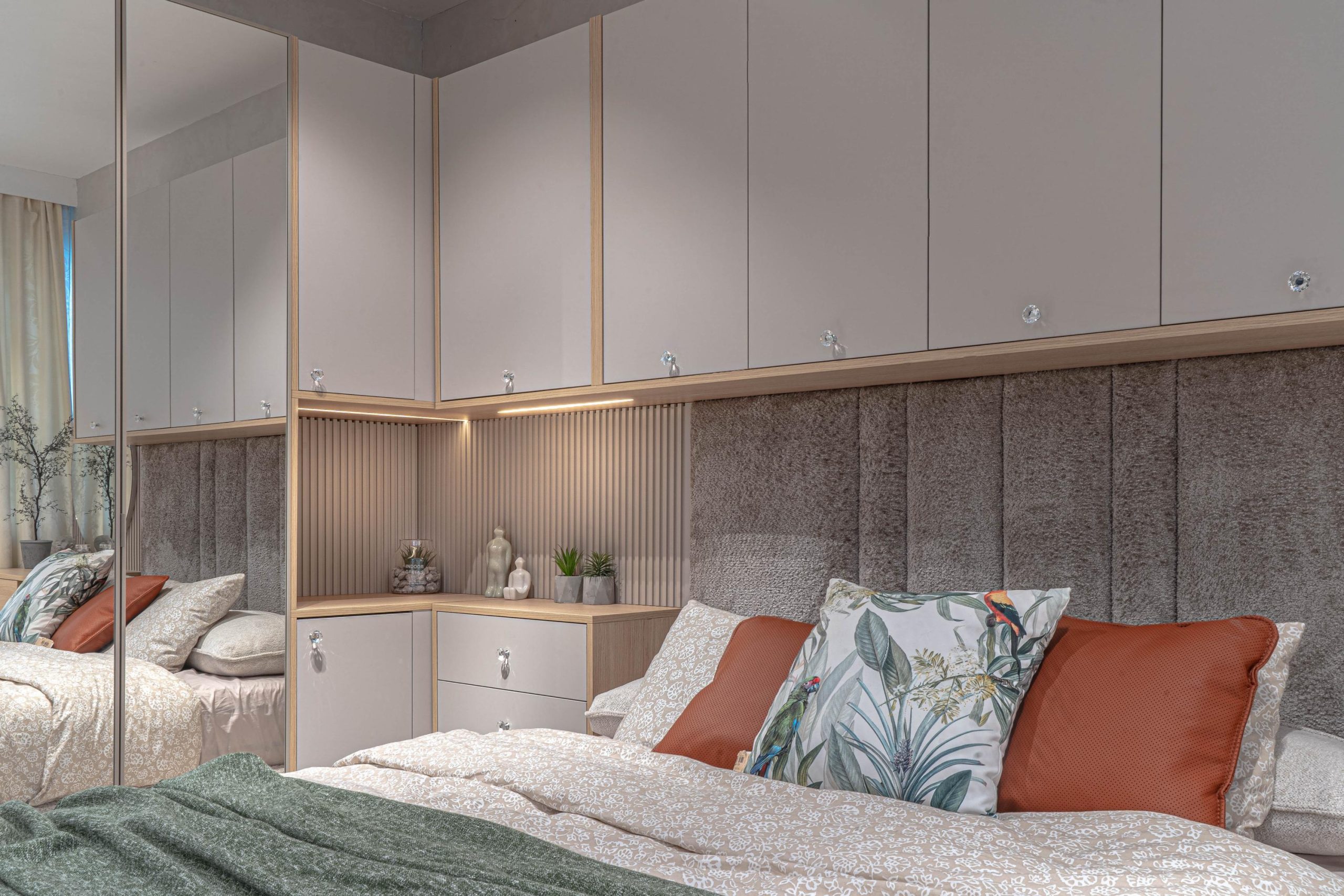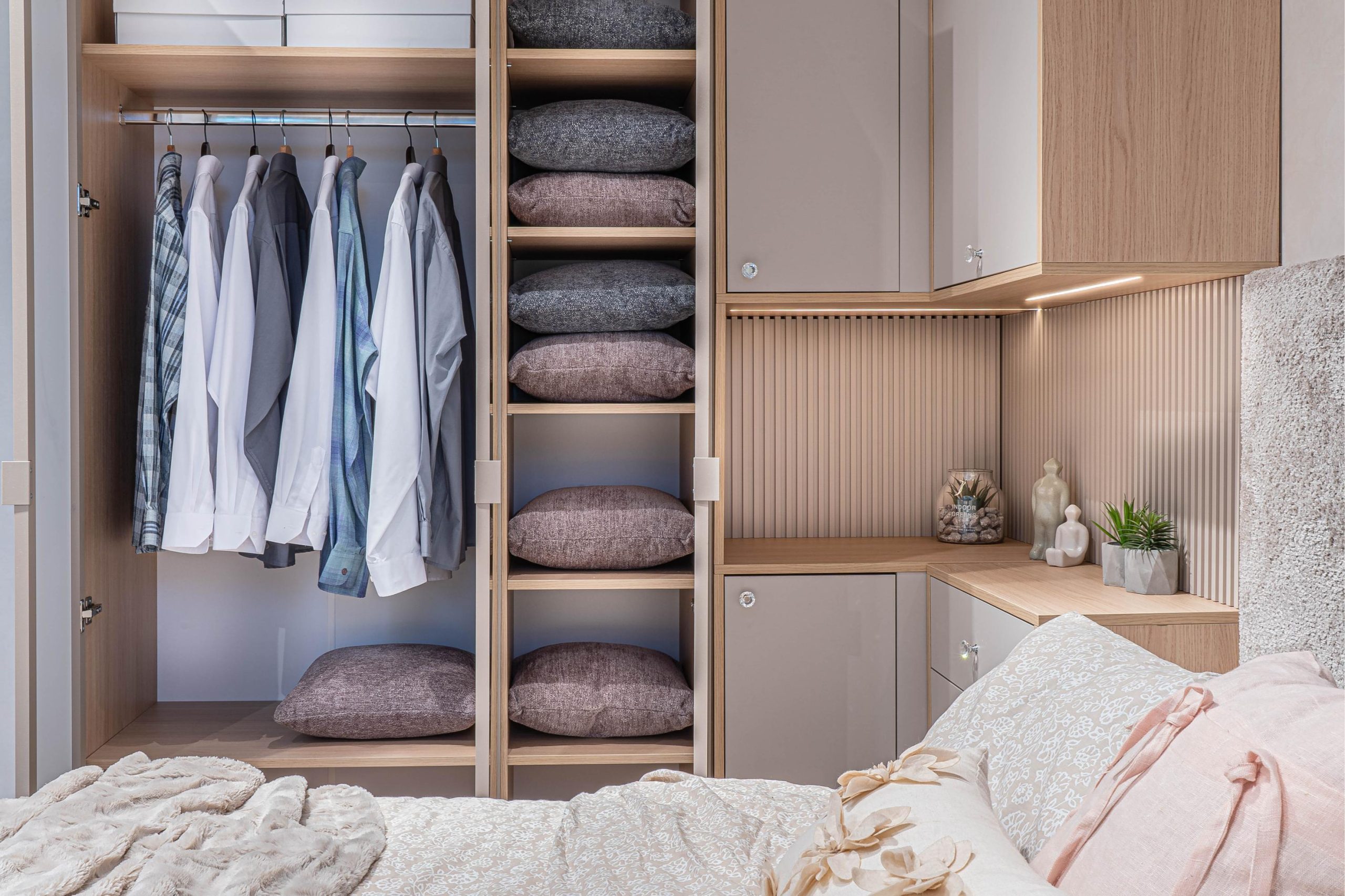 Ъглов шкаф – Вградено деликатно LED осветление – режим на работа – дистанционно – топла светлина – вкл. в цената. MDF гравиран на канали гръб – боя мат – цвят – кашмир. Дръжки – полиран кристал – безцветен. Водач на чекмеджетата – скрити Quadro Hettich – плавно затваряне, панти на вратите – плавно затваряне опция – реглаж – 1 бр. в к-т;