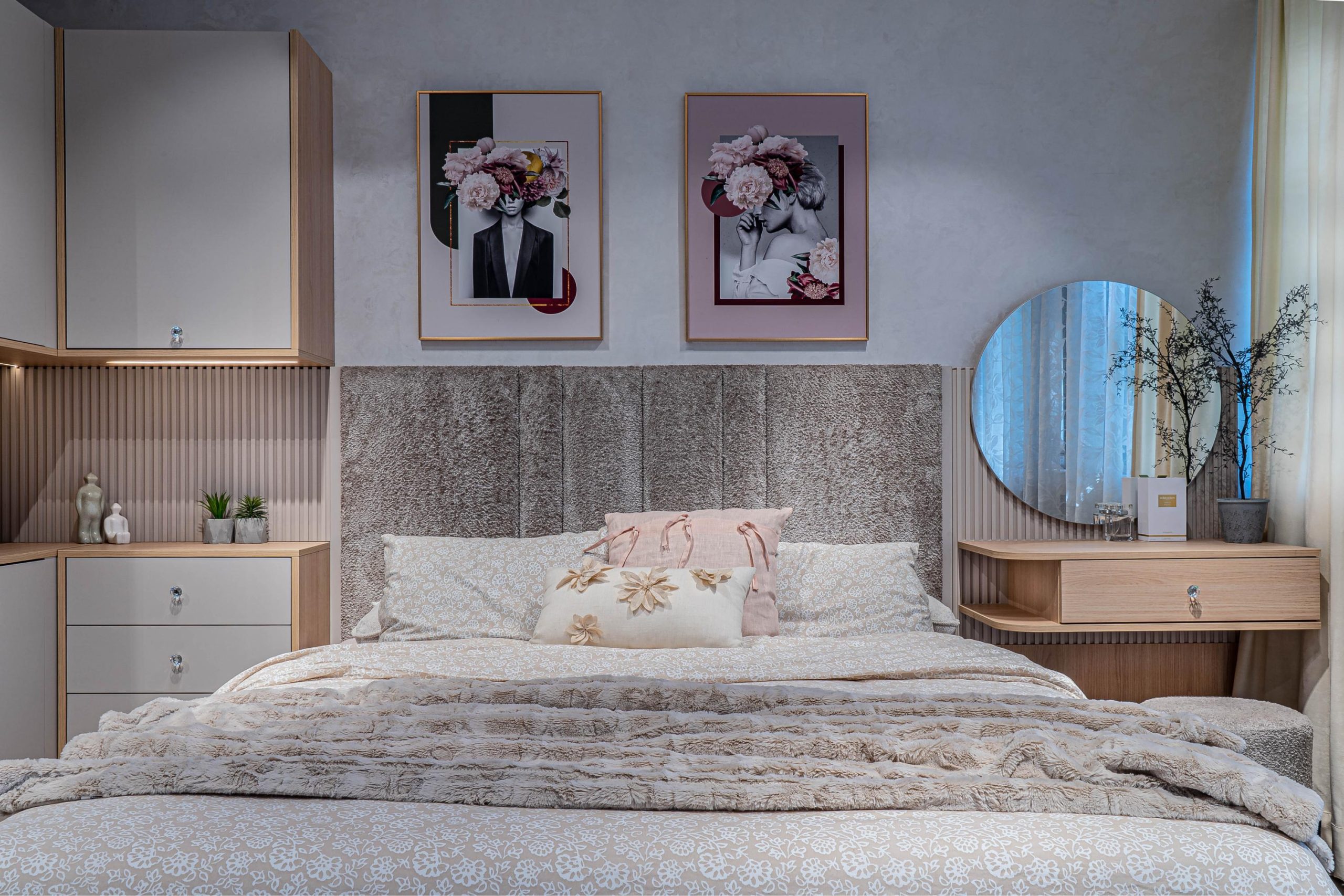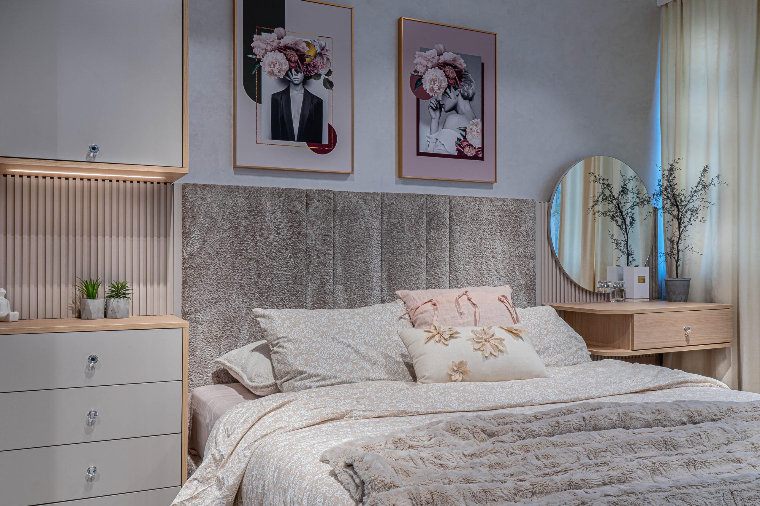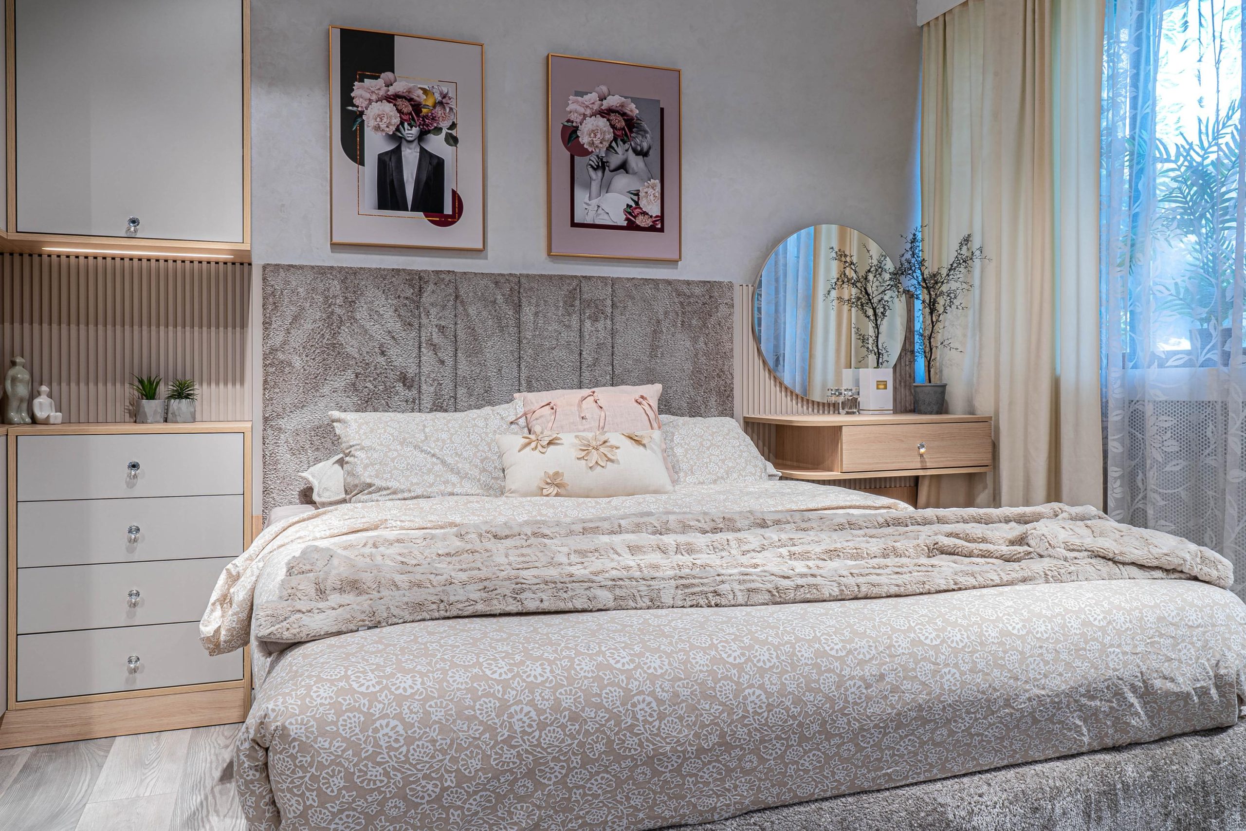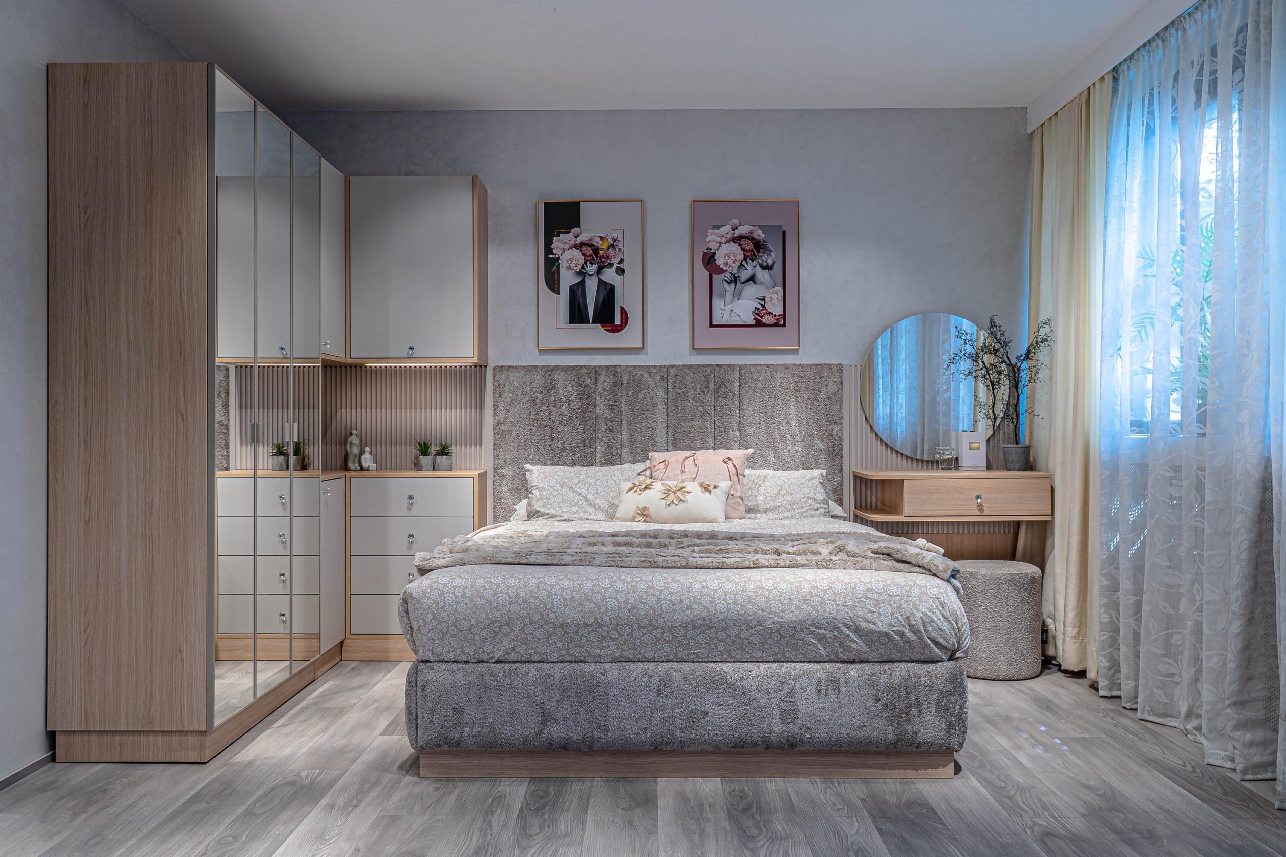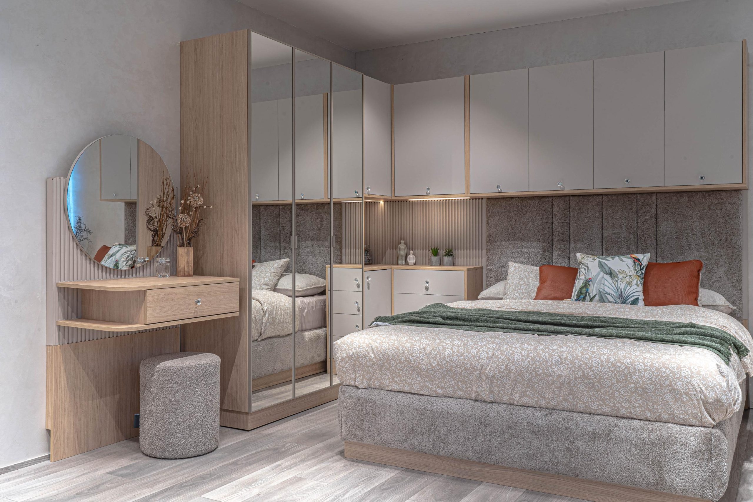 спален комплект „Лорейн“ е произведен от висококачествено ламинирано ПДЧ 18 мм EGGER декор – дъб виченца, съпътстващ декор ПДЧ 18 мм EGGER декор – кашмир; кантиран с цвета си – дебелина на канта – 1 мм – фасетиран по ръбовете.