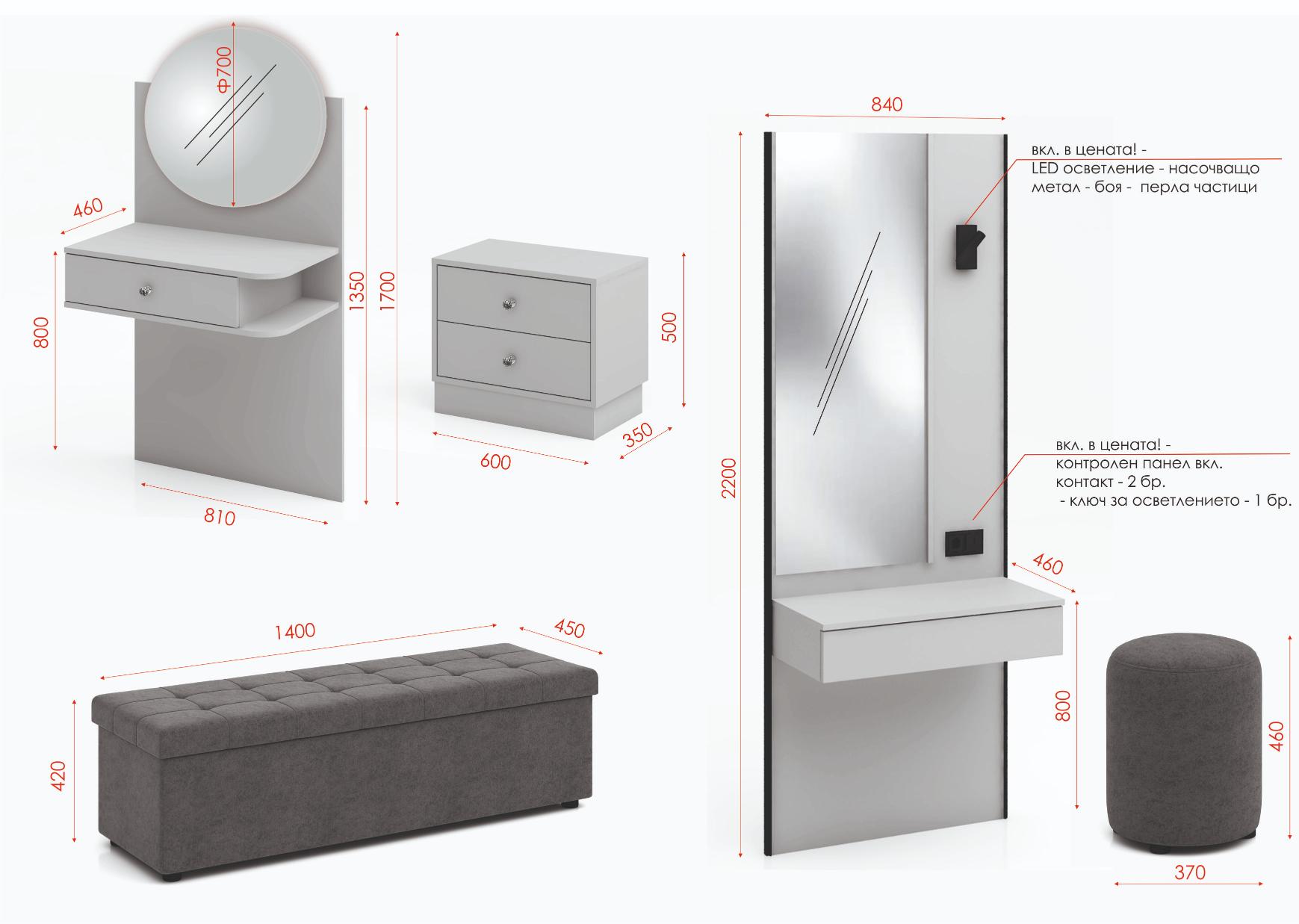 Гардероб: Огледало вградено в алуминиев профил – боя – бежов пясък. Трикрилно разпределение – комбинация – рафтове и лост за закачалки, панти плавно затваряне. Използвани са сглобки – скрит монтаж, метални рафтоносачи за стабилност на рафтовете, лост за дрехи – метален – форма – елипса – покритие – никел, цялата конструкция на гардероба е монтирана върху метални реглажни „пети“ – осигуряващи изрядна нивелация на изделието и правилната му експлоатация, – 1 бр. в к-т;