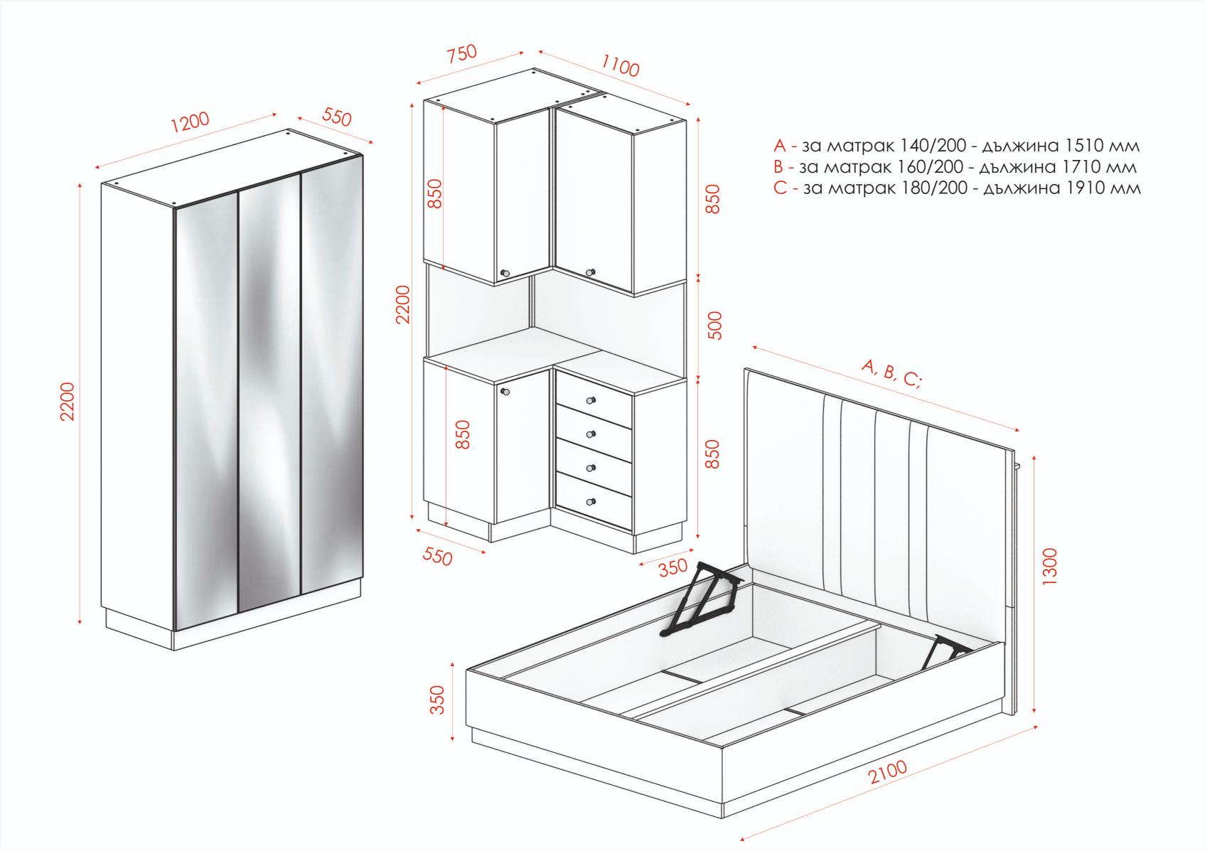 - над леглова надстройка – три размера – цени в панела;