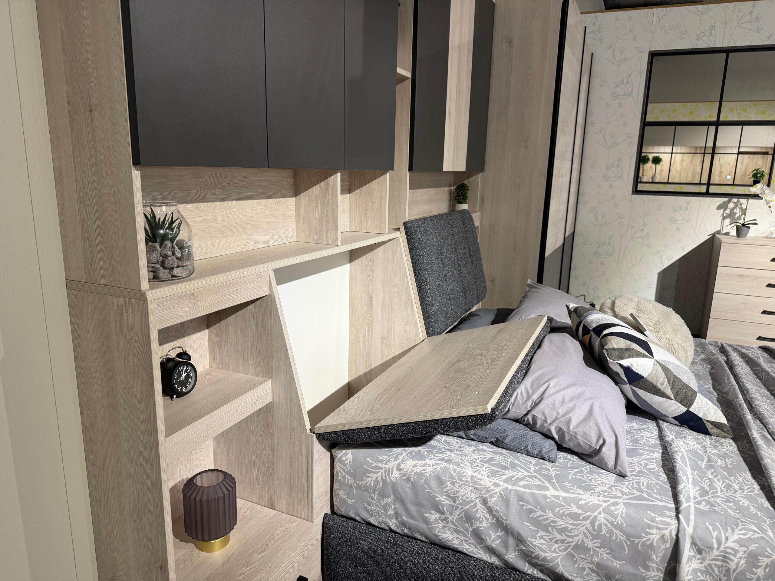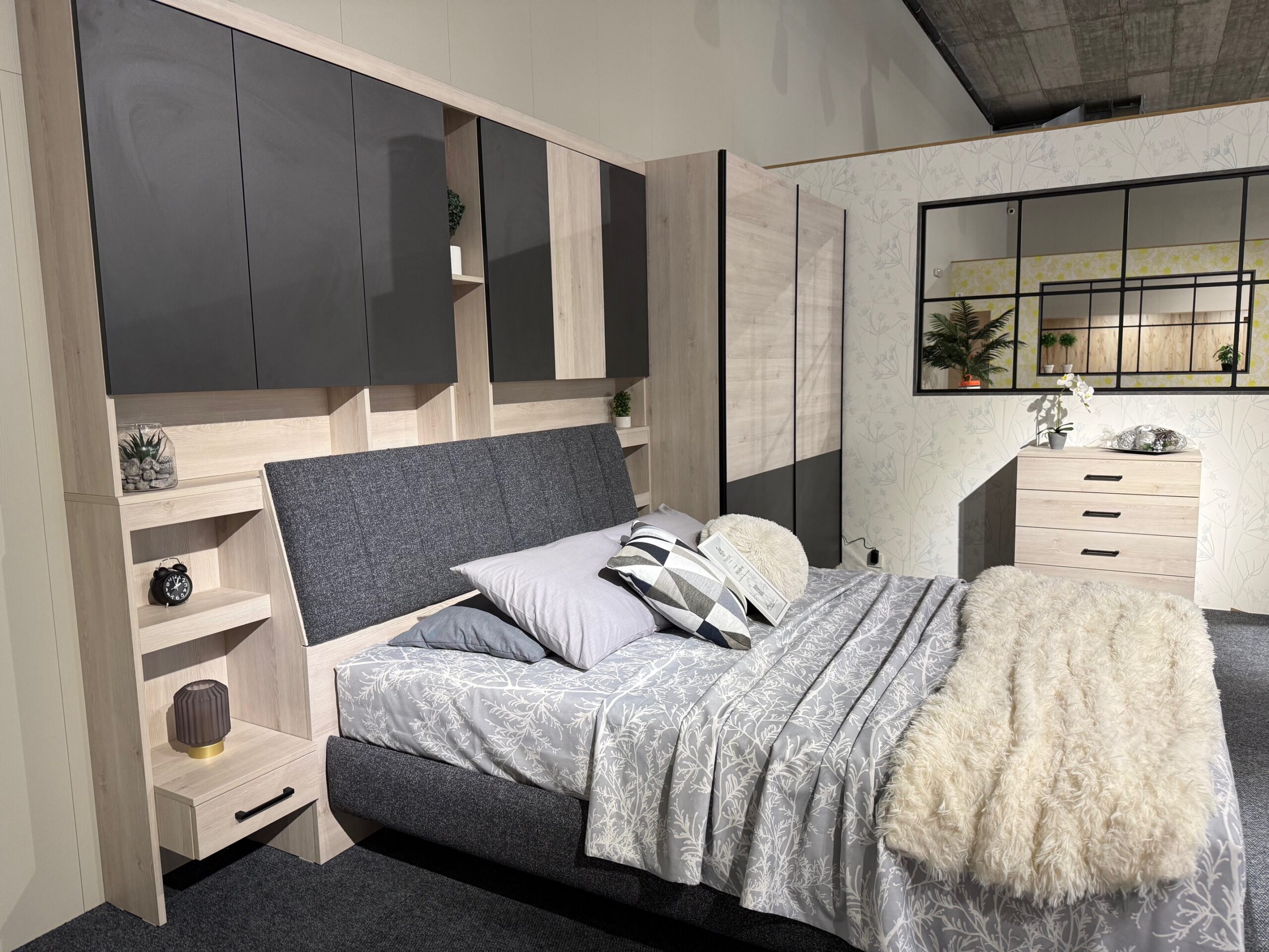Над леглова надстройка: Практични шкафове с достатъчно място за съхранение, панти плавно затваряне;