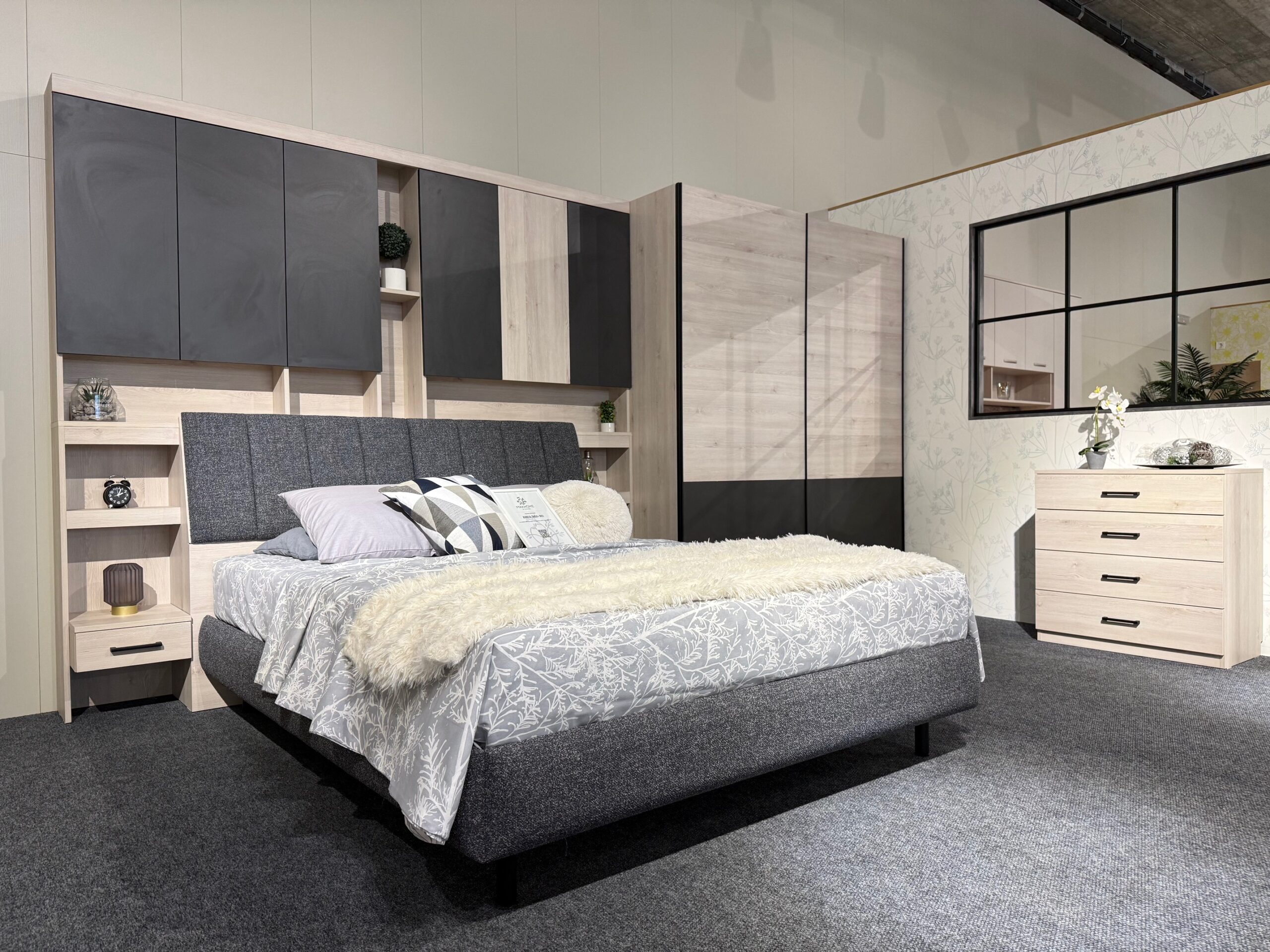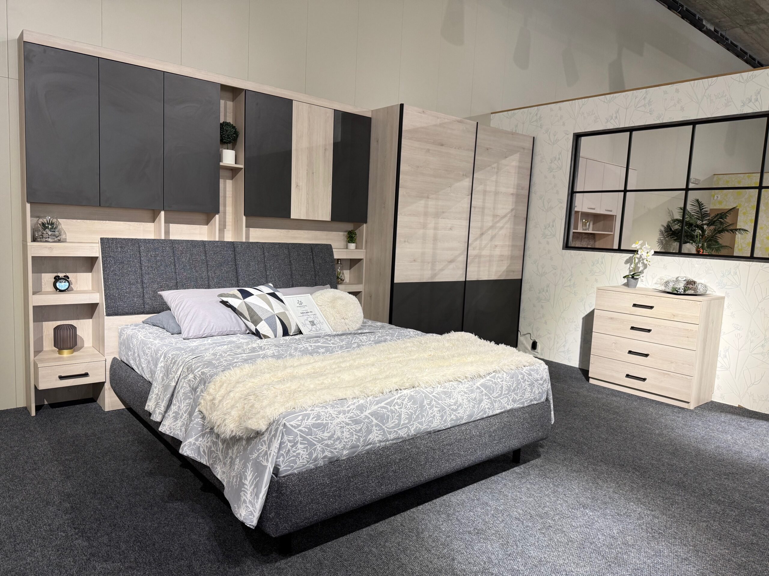 спален комплект „Виго“ е произведен от висококачествено ламинирано ПДЧ 18 мм – бор аланд EGGER, допълнителен декор – графит EGGER, всеки декор е кантиран с цвета си – дебелина на канта – 1 мм – фасетиран по ръбовете.